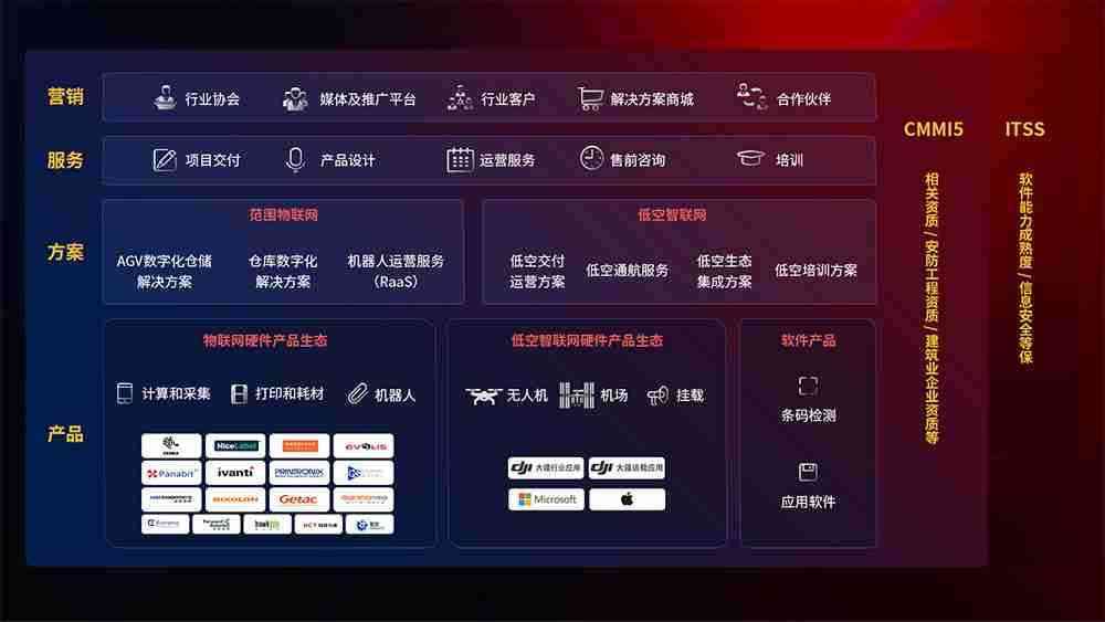 聚合国内外先进的物联网硬件产品品牌,,,,聚焦数字化仓储、、机器人运营、、低空智联网等领域,,,,共同打造适合客户业务场景的解决方案并提供交付服务