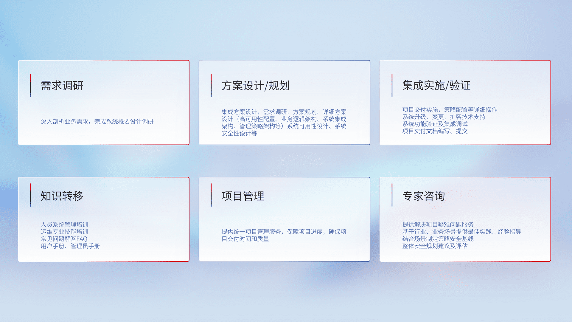 针对客户行业特性,,,,将宏观的安全战略和需求,,,通过专业的交付服务,,实现项目落地,,,,为客户提供标准规范的集成交付服务。。。